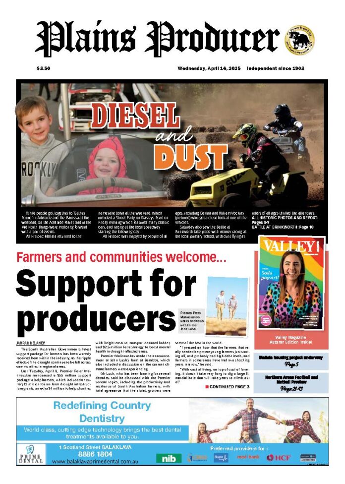 The Plains Producer – 16th April 2025 Subscribe or Login to see the rest of the content. Username Password * Remember Me Forgot Password News Fat Farmers launch Health Hub 13/12/2025 Fat Farmers Rural Health Initiative have soft launched their Health Hub at the Jamestown pageant on Sunday, 7 December. Fat Farmers offered free on... Explosion at Clare pizzeria 13/12/2025 The main street of Clare was rocked this morning following an explosion at a local pizzeria resulting in $750,000 of property damages. Just before... Kennedy voted in for Mudla Wirra 13/12/2025 Light Regional Council has welcomed a new elected member with Martin Kennedy elected as the new councillor for Mudla Wirra Ward. A supplementary election was...