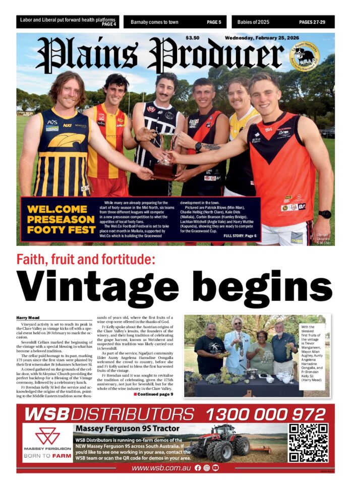 The Plains Producer – 25th February 2026 Subscribe or Login to see the rest of the content. Username Password * Remember Me Forgot Password News Babybels and Crows reveals: A grand Skilly wedding 27/02/2026 A statue of little baby cheeses and a defection to the Pride of South Australia were two of many highlights at the wedding of... Flood warnings issued for the Mid North 27/02/2026 The Bureau of Meteorology has issued two flood warnings for the Mid North region as rainfall is expected to sweep across the state this... Northern rural man charged with child sex offences 27/02/2026 After an investigation, a northern rural man has been arrested and charged with child sex offences. On Thursday, 26 February, investigators from SA JACET, a...