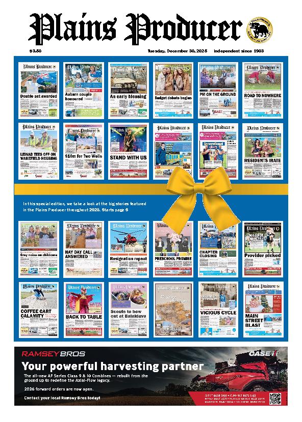 The Plains Producer – 31st December 2025 Subscribe or Login to see the rest of the content. Username Password * Remember Me Forgot Password News Looking Back on 2025 – November 30/12/2025 - The Adelaide Plains Male Voice Choir held its final concert after four decades of music, marking the end of the group which had... Mingling and jingling at Balaklava 30/12/2025 The Balaklava Christmas Pageant found a fresh new home this year, with festivities lighting up Ralli Park on Friday, 19 December. For the first... Looking Back on 2025 – October 30/12/2025 - The Weather it Together campaign was launched to support South Australian farmer’s mental health and wellbeing. - Jamestown doctor Dr Rowena Conway was named...