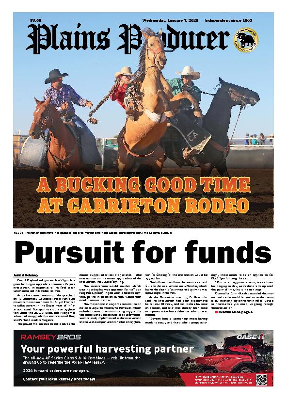 The Plains Producer – 7th January 2026 Subscribe or Login to see the rest of the content. Username Password * Remember Me Forgot Password News Christmas Trading Table success for Red Cross 08/01/2026 Two Wells Red Cross held its trading table and raffle sales at the Christmas Street Parade, Market and Carnival on Friday, 12 December. A... Extreme fire danger for Mid North 08/01/2026 The Mid North is among 11 districts listed to be facing an extreme fire danger ratings for tomorrow. The SA Country Fire Service (CFS) is... Train derailment near Pirie 08/01/2026 REGION - Australia's main rail corridor has been shut down after a train derailment south of Port Augusta on Tuesday, January 6. The freight train...