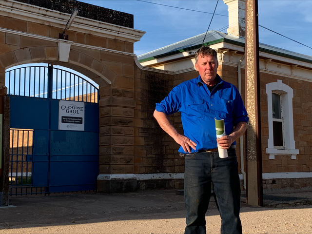 President of Gladstone Community Development and Tourism Association, David Catford, in front of Gladstone Gaol with a copy of the group's town development plan. (George Yankovich)