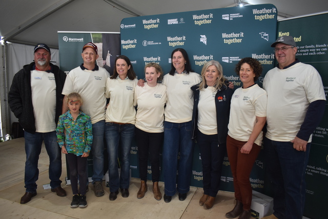 Pictured at the launch of Weather it Together at the Yorke Peninsula Field Days are, from left, Steve Whillas, Ben Lehmann with Edie Lehmann, Annabelle Ottens, Kate Gunn, Caroline Rhodes, Jo Collins, Justine Drew and John Gladigau. (Jarrad Delaney: 507726)