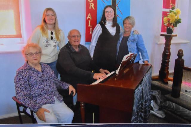 Don Bubner OAM, surrounded by his wife Kath, granddaughters Paige and Abbey, and daughter in law Rachel Bubner after being honoured by Owen Community Church in 2023. (Supplied)