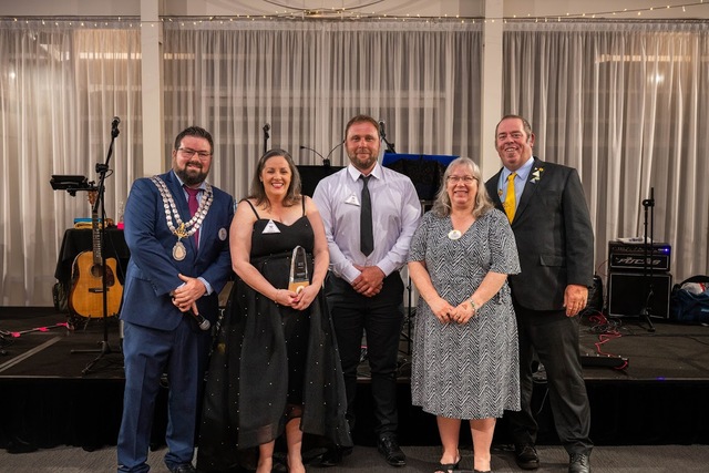 Outgoing national Apex president Ben Curnow presents the Club of the Year award to Jamestown Club secretary Donna Kelly and outgoing president Mark Blake, alongside previous winners Mel and Michael Godfrey from the previous club of the year. (Supplied)