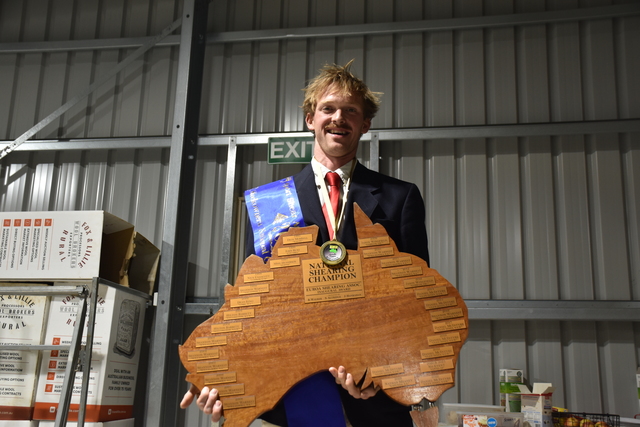 Sam Bacon with his maiden national shearing title after fairytale run. (Harry Mead: 513335)