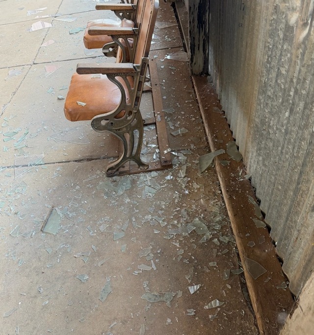Shattered glass lined the floors of the roundhouse at Steamtown. (Supplied)