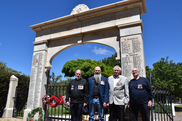 Local veterans gathered for the occasion and laid wreaths. Pictured is Leon Pollard, Miles Holmes, Len Cooper, and Ian Cullen. (Harry Mead: 516817)