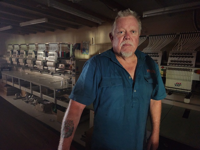 Tad's Embroidery Service owner Steve Renshaw in the dark on 14 March in front of the embroidery machines they could not use. (Jarrad Delaney: 465873)