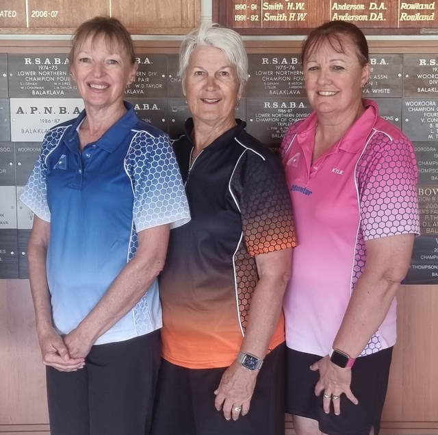 The team of Judy Rowett (Saddleworth), Pauline Mansell (Robertstown) and Kylie Day (Saddleworth) will play in the State Women’s Triples Final on 14 April. (Supplied)